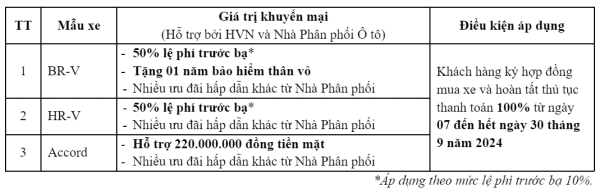 Đồng thời, HVN phối hợp cùng hệ thống Nhà Phân phối triển khai chương trình khuyến mại hấp dẫn từ ngày 07 đến hết ngày 30 tháng 9 năm 2024 dành cho các dòng xe nhập khẩu: Honda HR-V, Honda BR-V, Honda Accord.